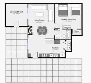 Unit 18-1A is a modern 1 bedroom featuring a large bedroom with a queen bed as well as full size wall bed if needed. The kitchen has an island, open space to entertain, washer/dryer and a dining room table. The living space has 2 large sliding glass doors and an open layout. The living room features a sofa (sleeper) and loveseat to relax in. Just outside is a large patio and a screened in porch with views of the lake.